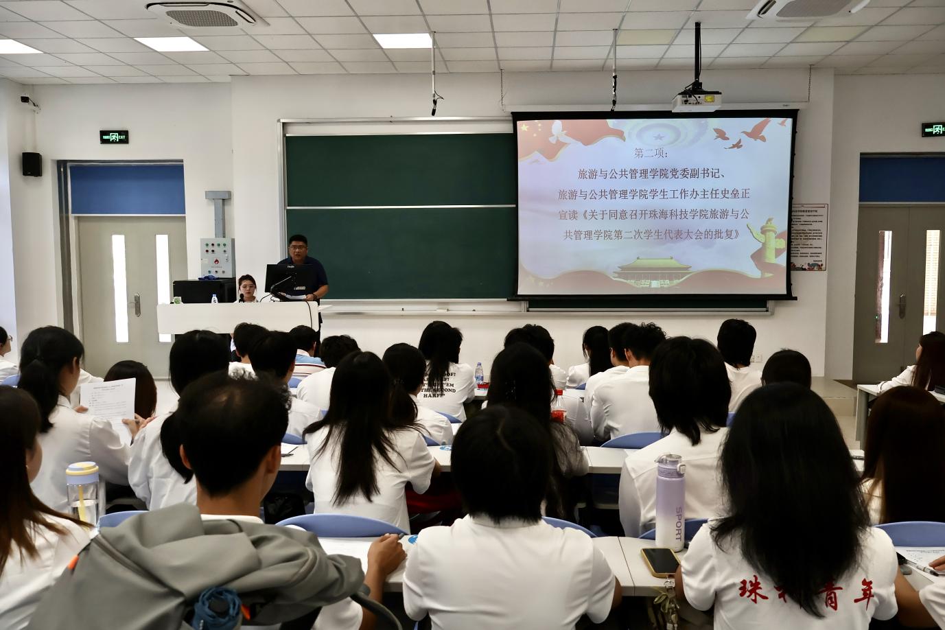 大会在庄严的国歌声中拉开帷幕。首先,旅游与公共管理学院党委副书记、学生工作办主任史垒正宣读《关于同意召开珠海科技学院旅游与公共管理学院第二次学生代表大会的批复》,为大会的合法合规召开提供了依据。随后,学生会主席团成员卓泽馨宣读《(校学生会)关于同意召开珠海科技学院旅游与公共管理学院第二次学生代表大会的批复》,展现了校院两级学生会组织的联动支持。