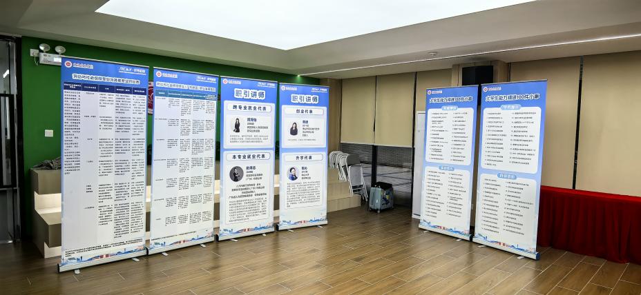 现场还搭建了职业生涯规划特色展示区,通过“大学生能力精进100件小事”“劳保职场地图”“劳保与其他专业对比”等主题展板,系统呈现劳动保障专业的就业路径、能力模型与发展优势,助力学生更直观地理解专业前景,做好自我定位。