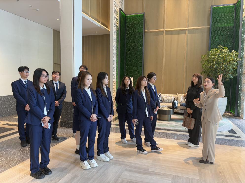 为推进产教融合,落实应用型人才培养目标,2026年4月9日,旅游与公共管理学院2024级、2025级酒店管理专业学生在汤文霞教授、刘艳侠老师的带领下,前往珠海拱北凯悦酒店开展课程实践教学活动。本次实践结合2025级《文旅行业创新创业实践》与2024级《酒店业营销社会实践》两门专业课程的内容进行实景教学,旨在让学生在不同学习阶段,分别从创新思维、创业视角以及营销实操层面,深入理解高端酒店运营逻辑与行业前沿动态。