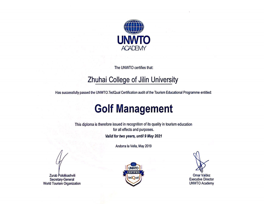 高尔夫管理专业方向隶属于旅游管理专业,为国家一流本科专业建设点,广东省一流本科专业建设点,高尔夫管理连续两轮通过联合国世界旅游组织(UNWTO)教育质量认证(TedQual),现为全国民办高校中唯一获此殊荣的高校。教学团队有教授1人,副教授5人,博士教师2人,骨干教师全部拥有高尔夫资格证书。建有占地27000平方米的高尔夫教学中心,有30个打位。历经15年实践,培养出13位国际高尔夫裁判,占全国总量的1/5,16位国家级裁判,成为全国培养高水平裁判最多的高校,被誉为“中国高尔夫裁判人才的黄埔军校”;还有职业球员黄秋波、国家高级教练王梦晗、8名国家初/中级教练、10名企业高管及5名高校教师,形成推动行业发展的“珠科力量”。